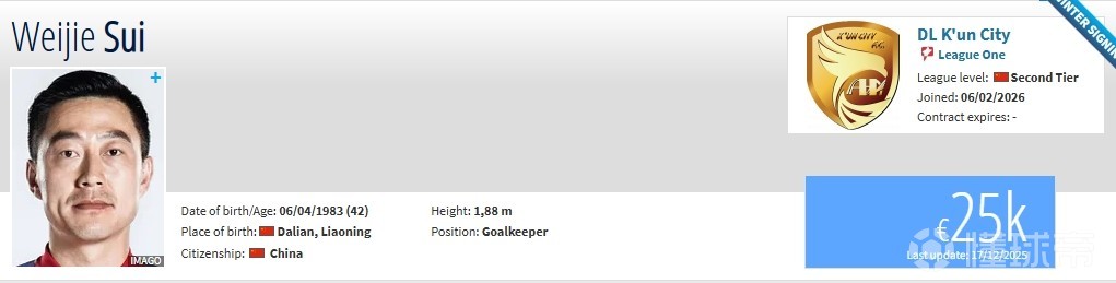 德转:42岁原大连英博门将隋维杰加盟大连鲲城